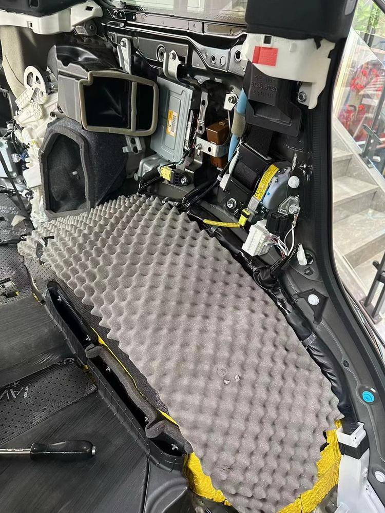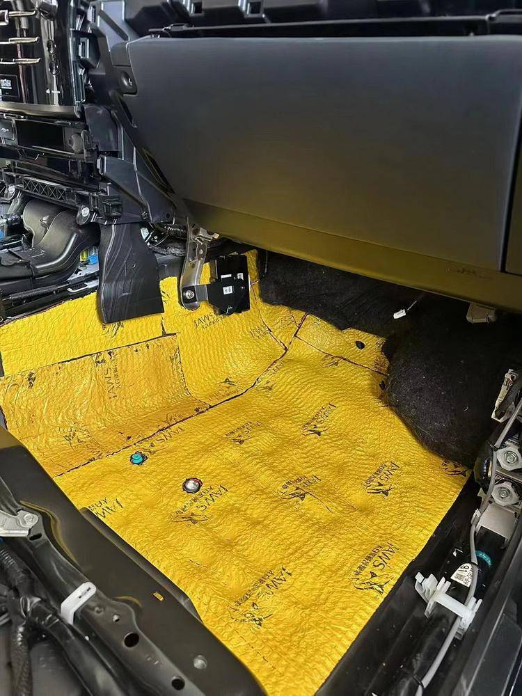 处理完车门,来到噪声的重灾区——底盘和尾箱。作为整车的承载机构和传动机构,底盘和尾箱自然也不会很小。不得不说的是汽车的脚踏位处还是发动机舱内主要噪声的传入部位。技师先使用金鲨JS300,铺满整个底盘、脚踏位和尾箱,从根源上解决低频共振的产生。然后使用隔音垫对底盘、脚踏位和尾箱做隔音处理,减少了各种噪声的传播。