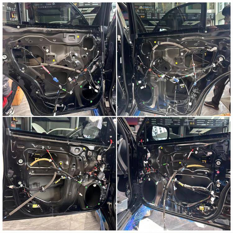 开关车门可以听到很厚重的声音,这说明其铁皮结构其实很厚实,但是当拆掉门板饰盖以后,就可以发现其用料有些敷衍了,简单的塑料薄膜几乎很难起到止振和阻止风噪的目的。所以技师将原车隔音材料清除,使用金鲨JS300重新对门板内外做双层止振处理,以降低门板钣金共振,并阻止风噪传入。