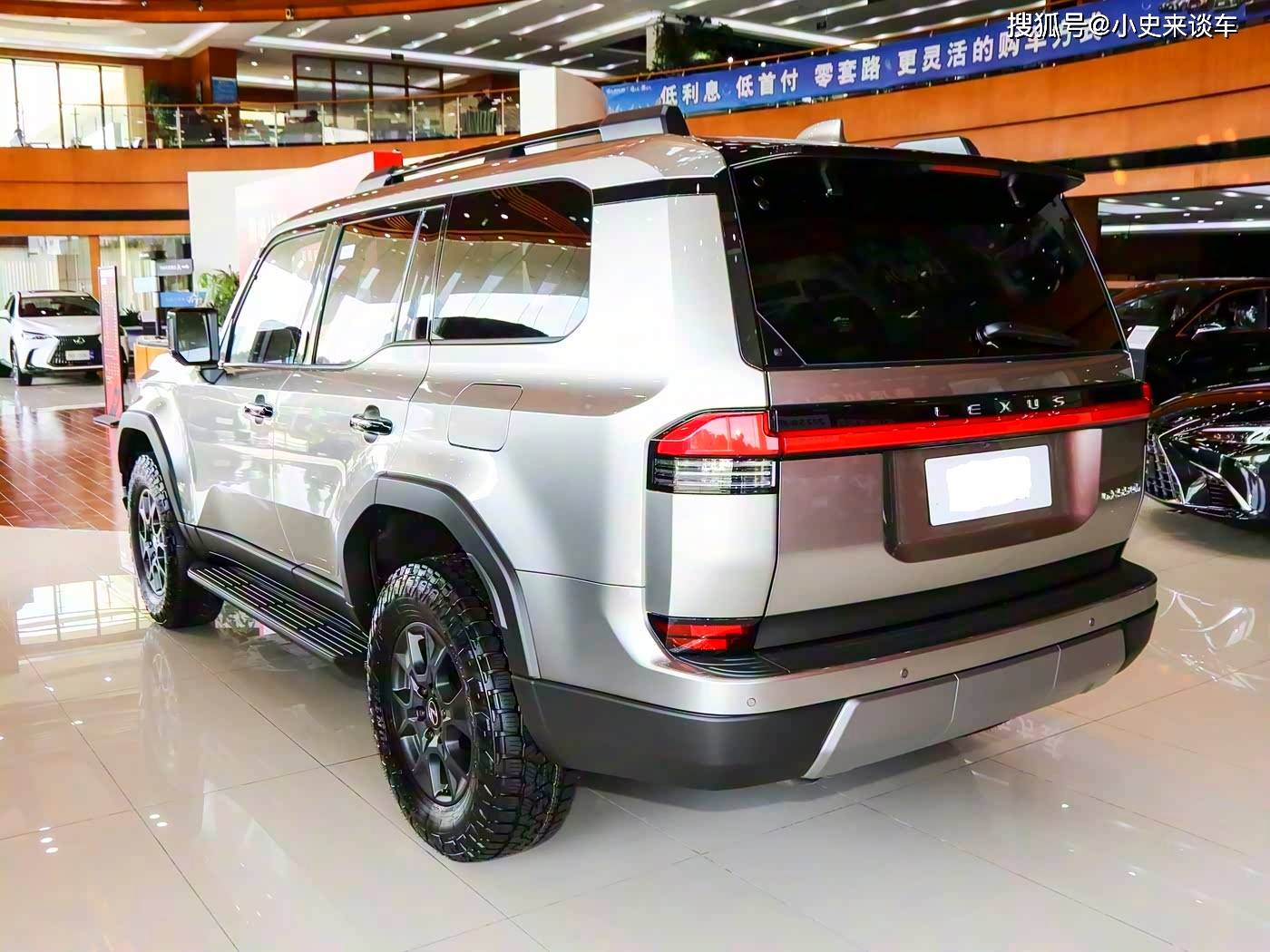 再来看车尾部分,贯穿式尾灯组采用三层立体设计,中间嵌入"LEXUS"字母标识,夜间点亮时具有极高辨识度。后风挡可单独开启的设计延续了家族传统,搭配电动尾门和拖车钩(最大牵引力3500kg),兼顾日常使用与越野需求。后保险杠采用与车身同色设计,下方护板集成倒车雷达和摄像头,整体造型既符合空气动力学又不失硬朗气质。
