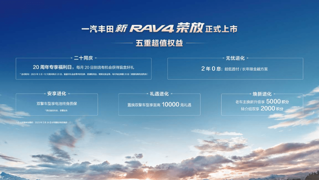 挚爱20载,深情礼遇,为回馈广大用户的支持与热爱,一汽丰田新RAV4荣放带来了5重超值权益,让用户轻松感受“全能超进化”的出行生活。5重权益分别为:①二十同庆:20周专享福利日,每月20日到店,有机会获得盲盒好礼;②无忧进化:2年0息,超低首付/长年限金融方案;③安享进化:双擎车型享电池终身质保;④礼遇进化:置换双擎车型享至高10000元礼遇;⑤焕新进化:老车主换新升级享5000积分,转介绍双享2000积分。