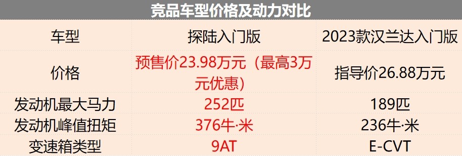 当然,单看探陆的参数或许不少人还理解不了,但对比汉兰达之后就能发现,探陆这套动力系统是远胜于汉兰达的。在圈哥看来,探陆不仅23.98万元起的预售价低于汉兰达入门车型,而且官方还给出了3000元抵2万元的购车款,加上置换1万元的现金补贴,也就是说探陆最高的优惠已经达到了3万元,算下来21万元左右价格就能买到探陆。这样看来汉兰达后期将面临很大的压力。