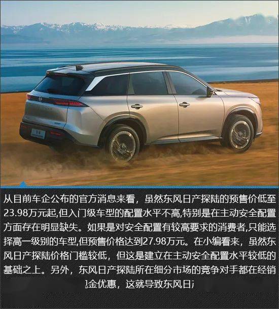 今年1月18日,东风日产公布了探陆(PATHFINDER)的预售价格区间,为23.98-27.98万元。按照规划,首批上市的东风日产探陆是中低配车型,未来还会有更高配置的车型加入。
