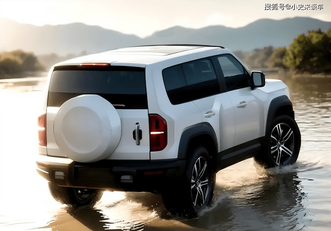 车尾部分的设计也是很紧凑,可以看到尾门采用了侧开式的设计,垂直明显的造型以及大面积的挡风玻璃,看起来也是十分的市场,并且两侧立体感十足的尾灯结合熏黑配色在夜晚点亮后辨识度很强烈,尤其是后挂的小书包设计也是彰显了新车的越野SUV定位,下方的保险杠还有着大面积的熏黑饰板包裹来呼应车头,增加了新车的整体感。