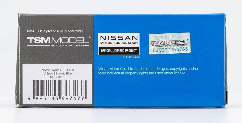 产品采用MiniGT标准风格的包装;模型有日产官方授权,产品的编号分别是341;纸盒内部是吸塑支撑,值得一提的是MiniGT一直都是软耳朵,这样可以避免刮碰掉后视镜。