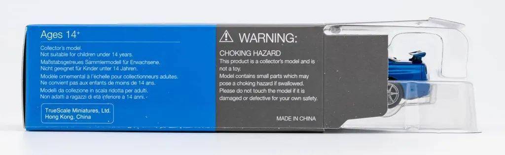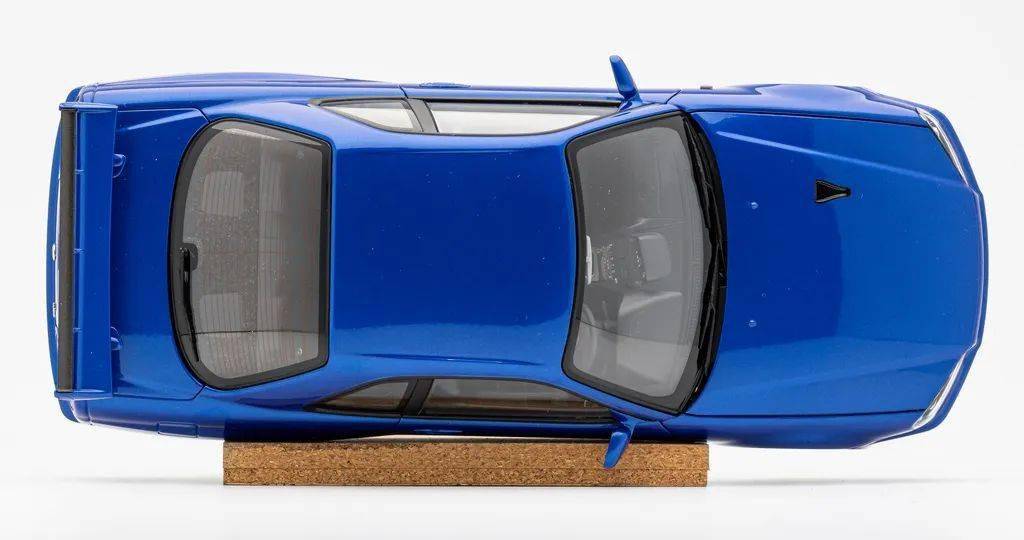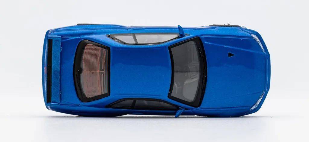 模型的大灯是独立件,内构还算清晰,但内侧的水角没处理好;中网和底盘一体的,没镂空,浮雕的通风网涂成黑色,中间的车标应该是移印的;前杠上的通风口也都是浮雕的,前唇是黑色的,但有飞边现象;转向灯也是移印上去的,质感一般,后视镜比较小巧,也涂成了蓝色,但稍微耷拉下来了。