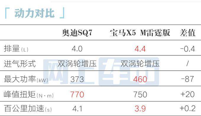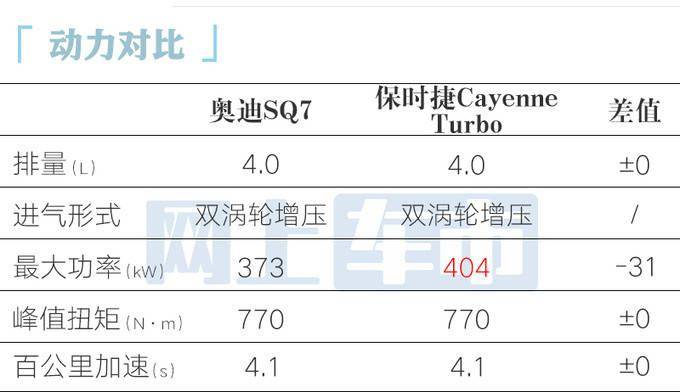 奥迪SQ7与保时捷Cayenne Turbo搭载的4.0T V8发动机同属EA825系列,动力性能较为接近,匹配8AT变速箱以及托森全时四驱系统,标配运动空气悬架、后轮转向系统,大幅提升整车操控性能。