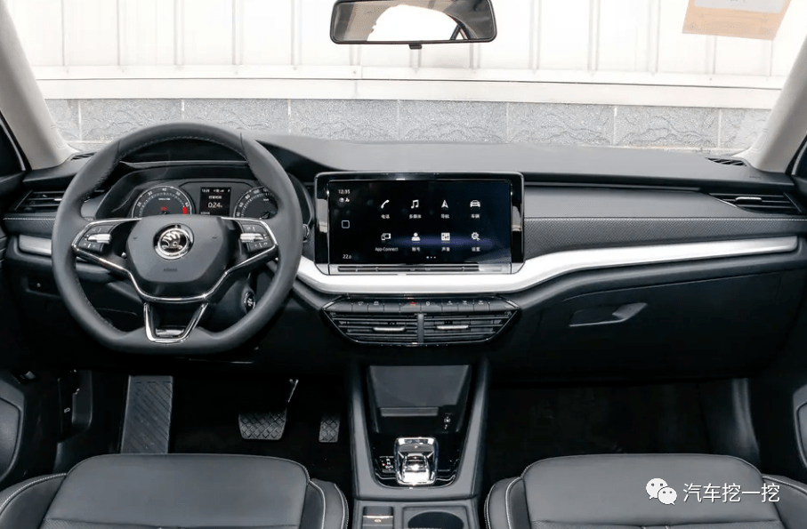车身侧面的轮毂平稳且流线型,腰线精致,层次感清晰。A、B和C柱采用熏黑风格处理,底部配有五辐铝合金轮毂。尾部造型饱满,尾灯由外向内延伸,点阵式造型在夜间照明时易于辨认。黑色包裹的下部和双排气布局增加了运动感。尾部设计几何元素丰富,展现出强大的气势。为了营造豪华感,车尾放弃了传统的车标,改用斯柯达独有的英文字母“Skoda”。