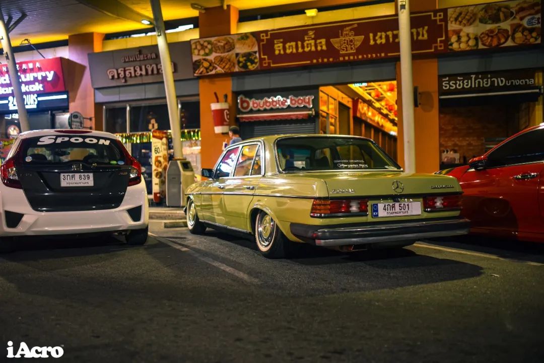 另一侧略显冷清的停车区暗藏着这台罕见的柴油版300D(W123),与老哥那台W115相比,这种保留原始元素的风格或许更加受众