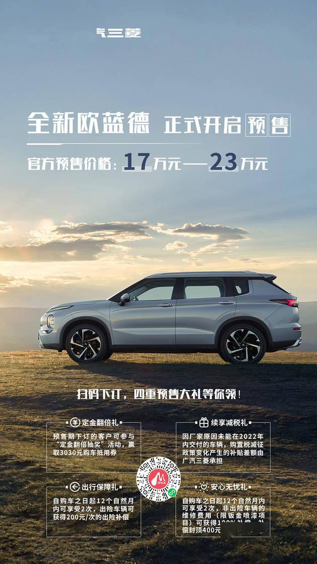 2022年9月30日,广汽三菱全新欧蓝德正式开启预售,官方预售价17-23万元。作为三菱汽车的全球品牌战略车型,新车在外观设计方面进行了全面革新,动力方面搭载三菱全新一代1.5T 4B40发动机和48V轻混系统。