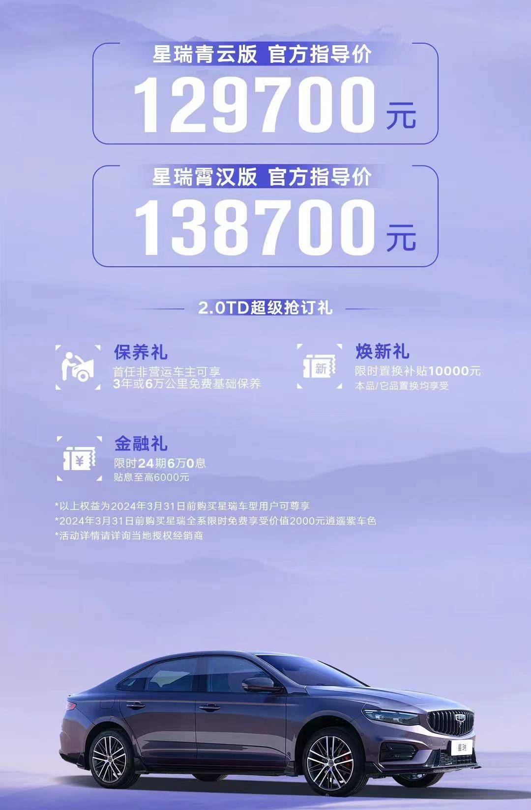 北京时间3月26日,笔者从吉利汽车官方获悉,吉利星瑞新车型现已正式上市,其中2.0TD青云版的指导价为12.97万元,2.0TD霄汉版的指导价为13.87万元。本次推出的2款新车型均配备驭境黑外装套件,动力方面采用2.0T四缸发动机匹配7速湿式双离合变速箱。