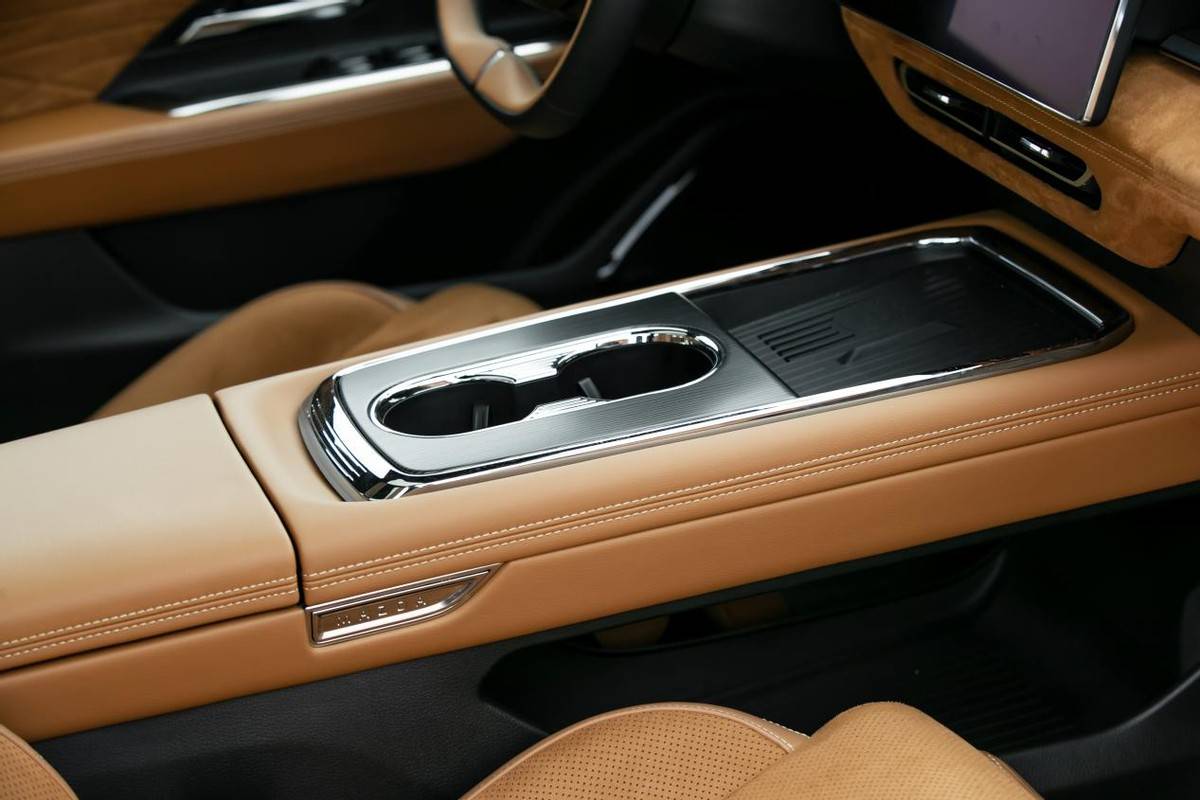 10.1英寸全液晶仪表、14.6英寸悬浮屏,还有双辐式平底方向盘,第一印象非常简洁。环抱式座舱、黑棕双色,座椅NAPPA真皮与麂皮绒面料组合,哑光电镀出风口,INS工艺雅奢木纹饰板,一套组合拳,老练的豪华氛围。