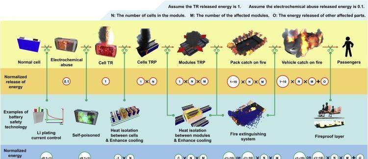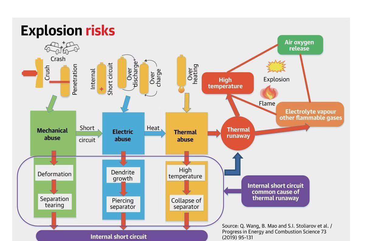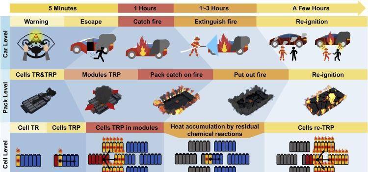 当一辆电动汽车着火时,故障的根本机制非常复杂,随着电池单元内部的热失控的持续进行,热量传播将引发其他电池的故障,泄漏的气体燃烧会释放额外的热量。