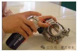 3)用手扳开节气门体阀片,将阀 片固定在最大开度,用化油器清洗 剂喷洗之前未能清洗到的死角上 的污垢。