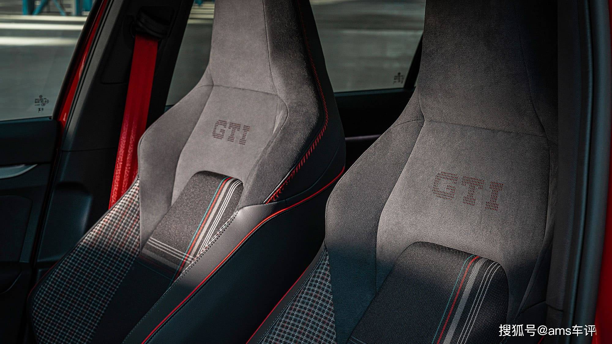 尾翼、后视镜内侧印有GTI 50标志;车顶与后视镜外壳为黑色,并辅以从黑到红的渐变侧条纹,强化视觉冲击。