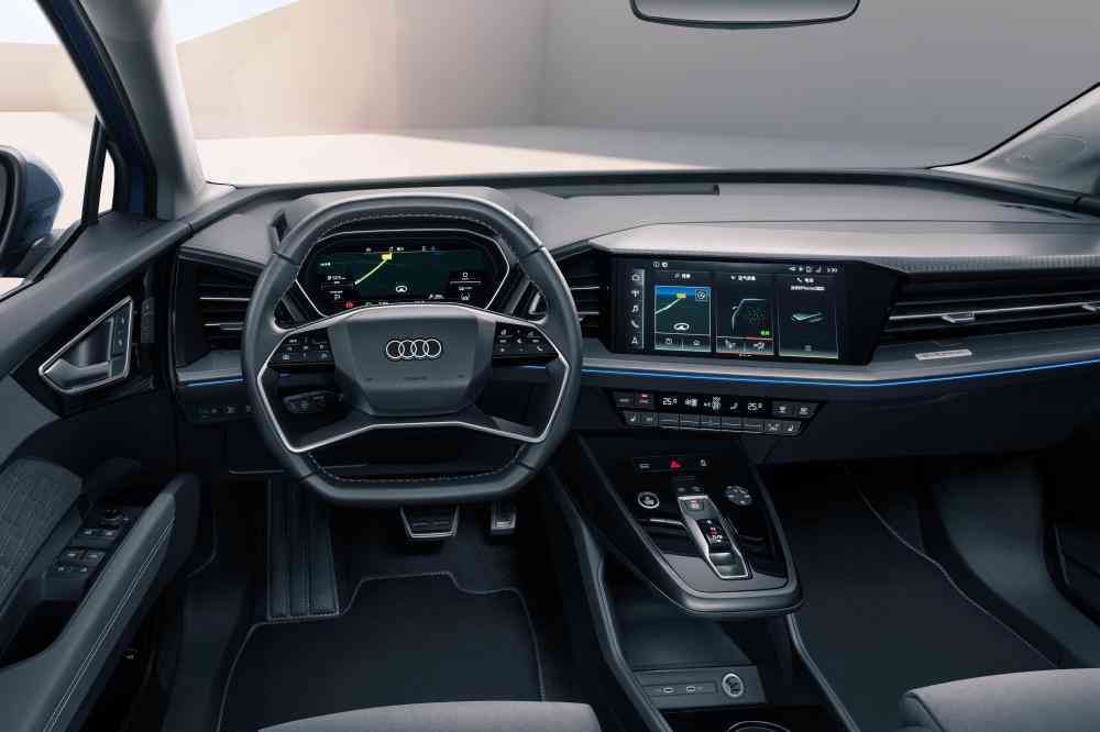 在内饰方面,奥迪Q4 e-tron整体采用科技布局,在关键接触面上不仅采用软质材料包裹,在细节上有银色镀铬件与黑色钢琴烤漆进行点缀,使内饰充满高级感。10.25寸触控显示屏和11.6寸的数字仪表盘采用一体式悬浮曲面屏设计,内置奥迪最新的车机系统,拥有丰富功能。奥迪Q4 e-tron车内采用三区自动空调,前排是双区自动空调,后排是单区自动空调,满足不同乘客需求。车内还装配多色氛围灯,伴随音乐律动,显得驾驶座舱充满了浪漫与科技感。