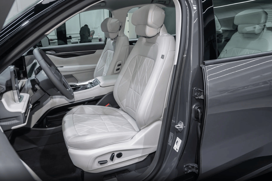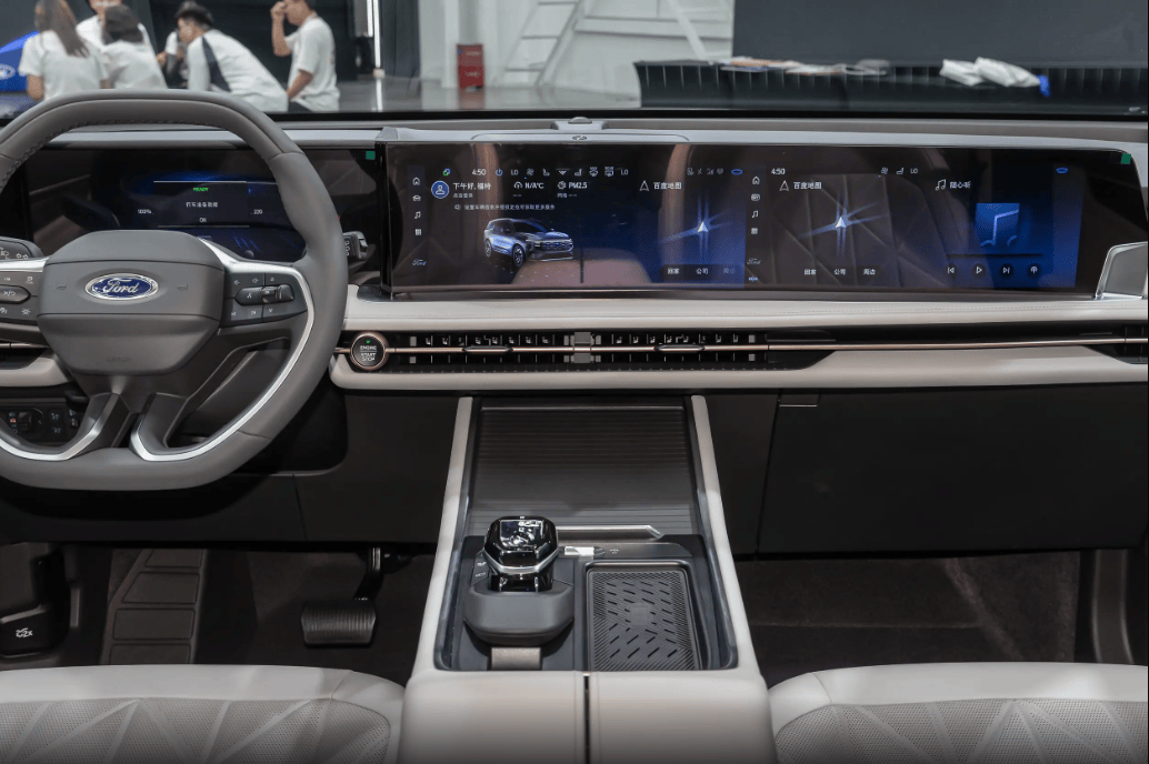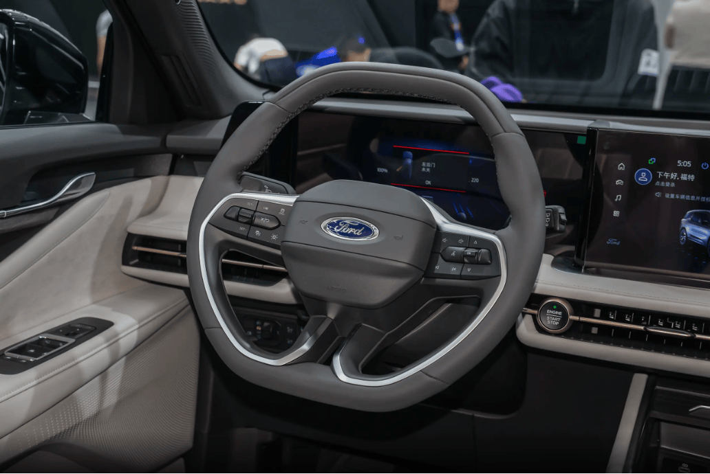 坐进福特锐界L车里, 整个座舱走的是简约大气的路子,中控台层次分明,软皮包得很足,摸上去不硌手,档次感一下就上来了。贯穿式出风口配点银色饰条,干净利落,不显老气,家用、商务都不违和。 科技感也给得很足,12.3英寸仪表+27英寸4K大屏连在一起,视野开阔、看着清晰,导航、电影、车机信息一屏全显,不零碎、不费劲。而且它不盲目搞全触控,常用功能还留着实体键,盲操作很稳,开车更安全。