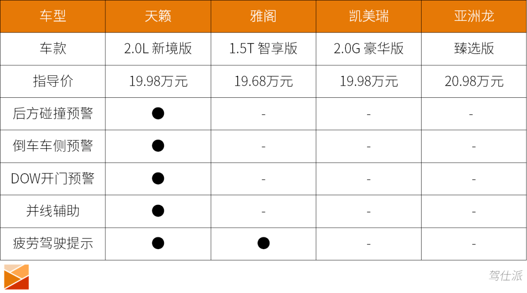 在家庭用户更为看重的安全层面,除了各种ABS、EBD之外,四款车型都有前方碰撞预警、车道偏离预警、主动刹车、车道保持辅助、车道居中保持等功能。但要是对比主动安全的配置丰富程度,天籁新境版的表现依然要更好一些。