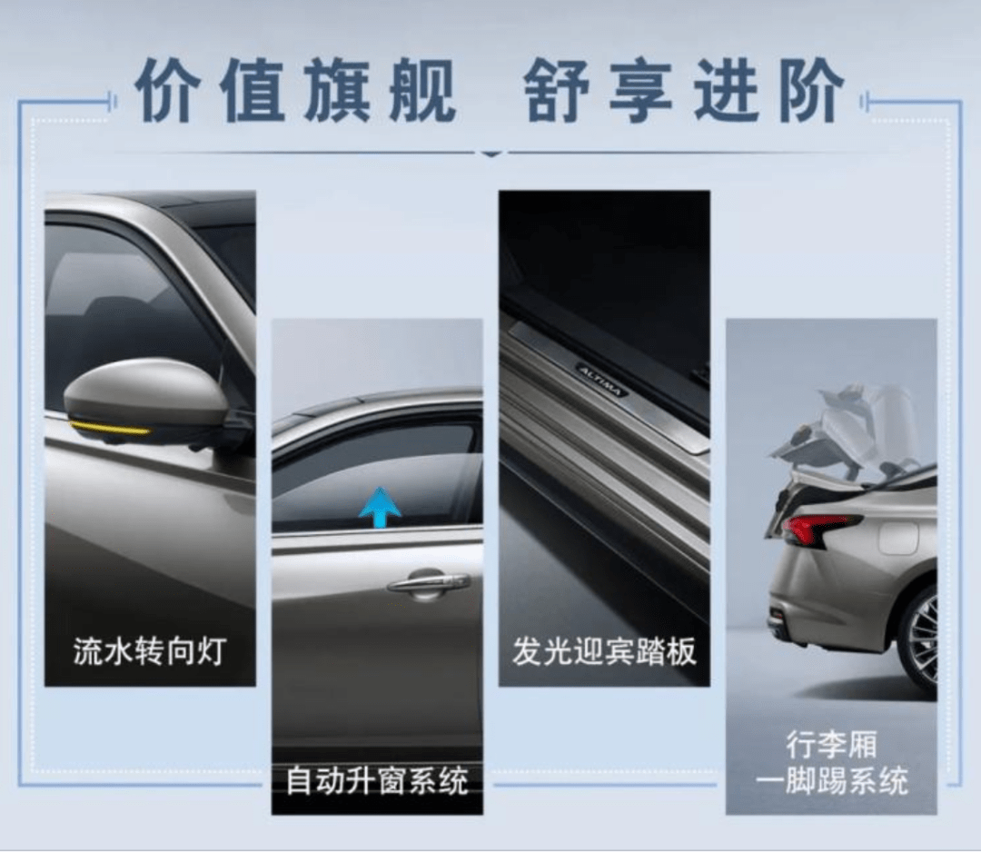 天籁新境版在2.0L XL-Upr 优享版的配置基础上进行了提升,增加了后视镜流水转向灯、自动升窗系统、发光迎宾踏板以及脚踢式感应后备厢门,而价格依旧为19.98万元。