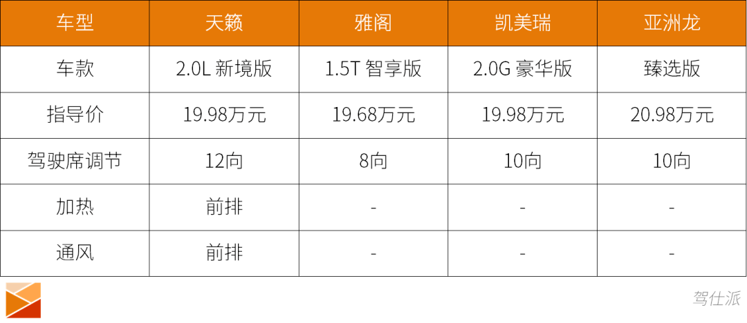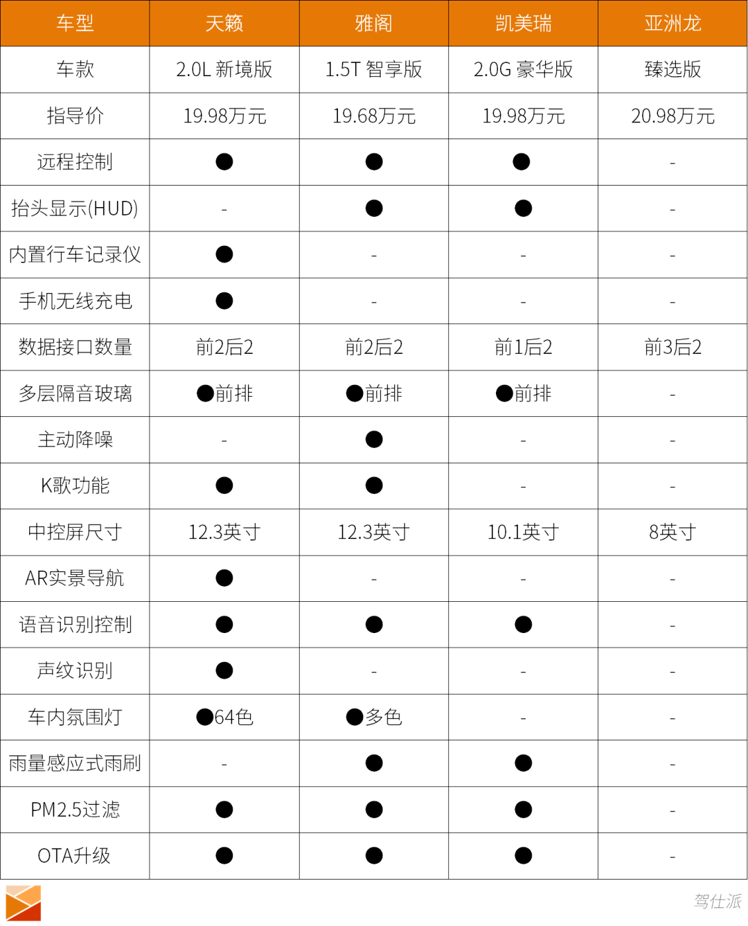 通过表格我们可以发现,即便抛开天籁的传统优势项目——乘坐舒适性不谈,在功能性方面,天籁新境版与价格相近的对手相比也有一定优势。