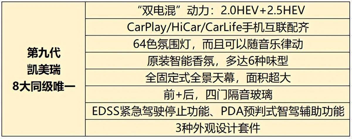 算上“一车双电混动力可选”(2.0HEV+2.5HEV),第九代凯美瑞有多达8项的同级唯一。