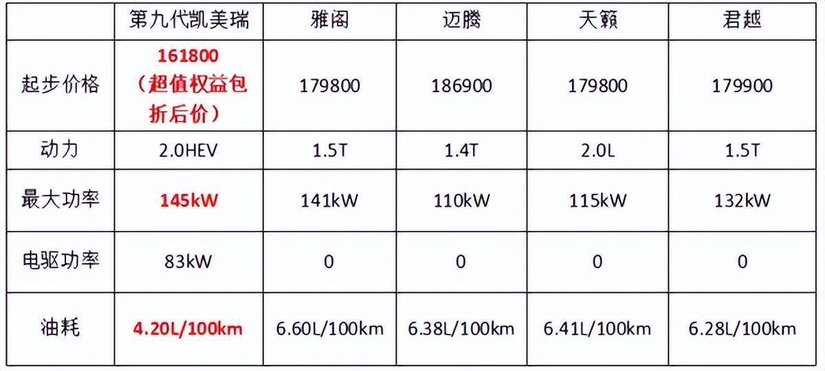 汽车用来跑,首先要看的当然是动力!第九代凯美瑞同等配置的燃油版和混动版差价只有8000元,想都不用想,肯定必须直接上智能电混双擎,我们看看大家的价格和动力对比。