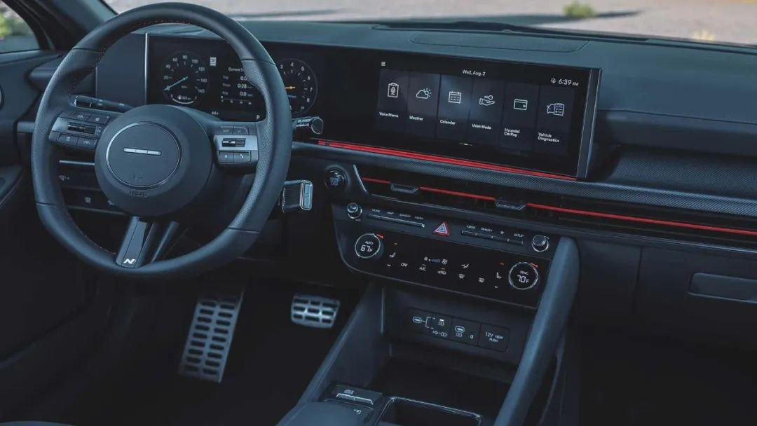 取消了十代索纳塔的“鲶鱼前脸”,采用的超大进气格栅棱角分明,占据了车头的大部分面积,上方是贯穿式灯带,分体式大灯和熏黑的中网设计,将整车的战斗感直接拉满,只看下半部分的话,甚至还与奥迪的RS6有着些许相似的地方。