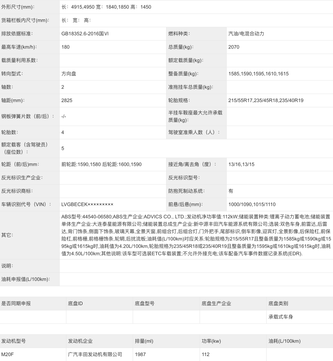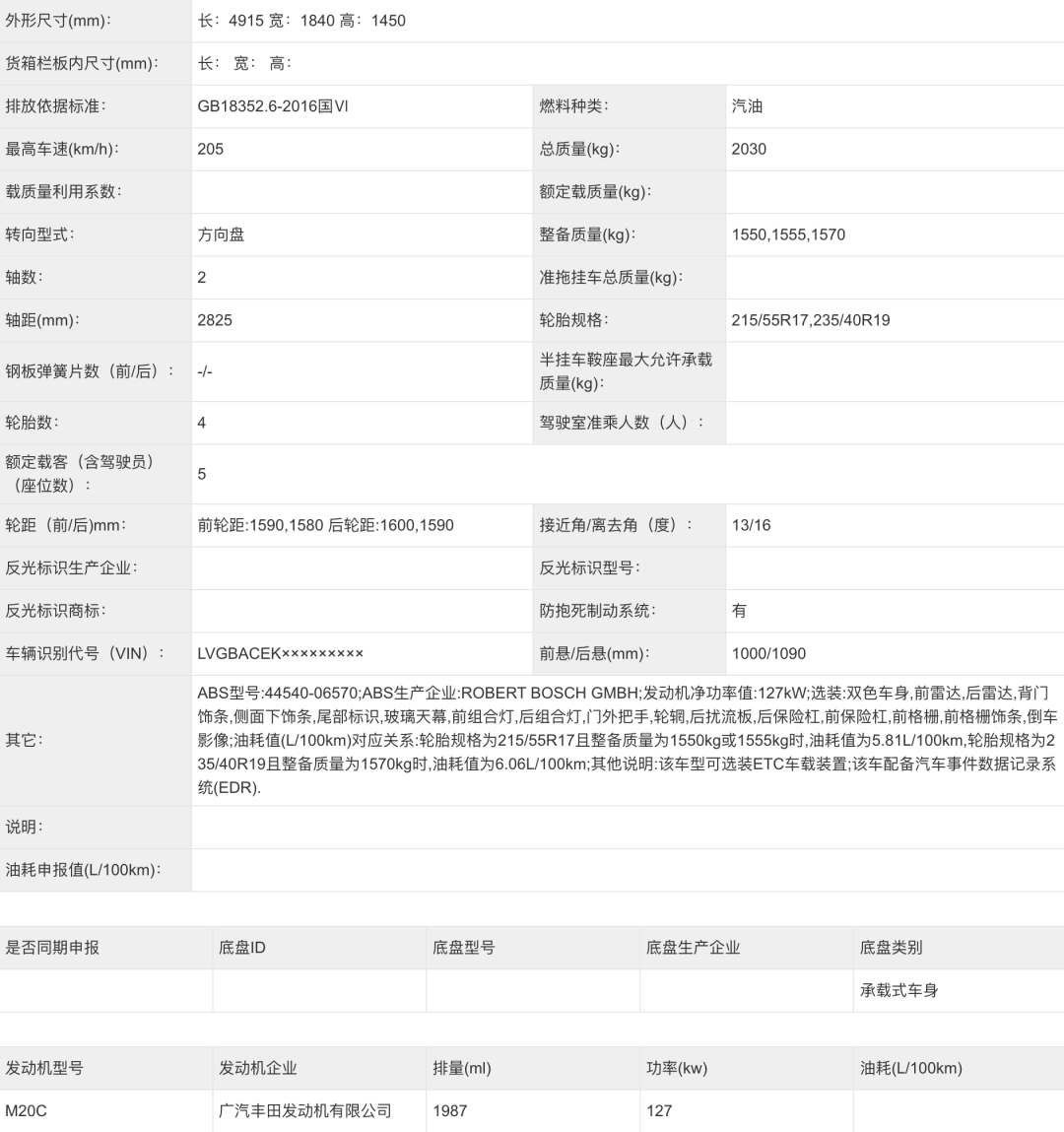 此次申报车型为2.0L燃油版以及2.0L油电混动车型,2.5L燃油版车型已经被取消。其中,2.0L自然吸气发动机长宽高分别为4915/1840/1450mm,轴距为2825mm;2.0L油电混合动力车型车身长宽高分别为4915(4950)/1840(1850)/1450毫米,轴距为2825毫米。作为参考,在售的凯美瑞车身长宽高分别为4885(4905/4900)/1840/1455毫米,轴距为2825毫米。