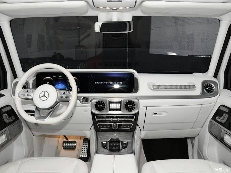 内饰方面,新车与目前现款奔驰G级的设计基本相同,采用了全液晶仪表盘与中控多媒体显示屏相连接的双联屏设计,并搭配了最新的双三辐式平底运动方向盘,中控台的设计依旧“G味”十足,中央通道区域则搭配了触控面板以及一些银色的装饰板点缀,即便是纯电动车也依旧能够展现出越野+豪华+科技化相融合的质感。