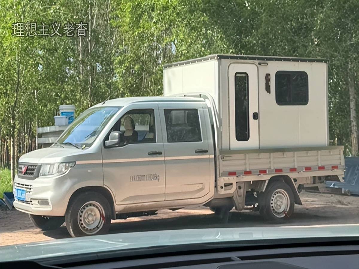 这是一台五菱荣光微卡,1.5L排量,手动5挡,2排5座,根据后斗尺寸定制了配套房箱,房箱四四方方,制作简单费用低,箱门在左前方,需要打开左栏板才能进入。