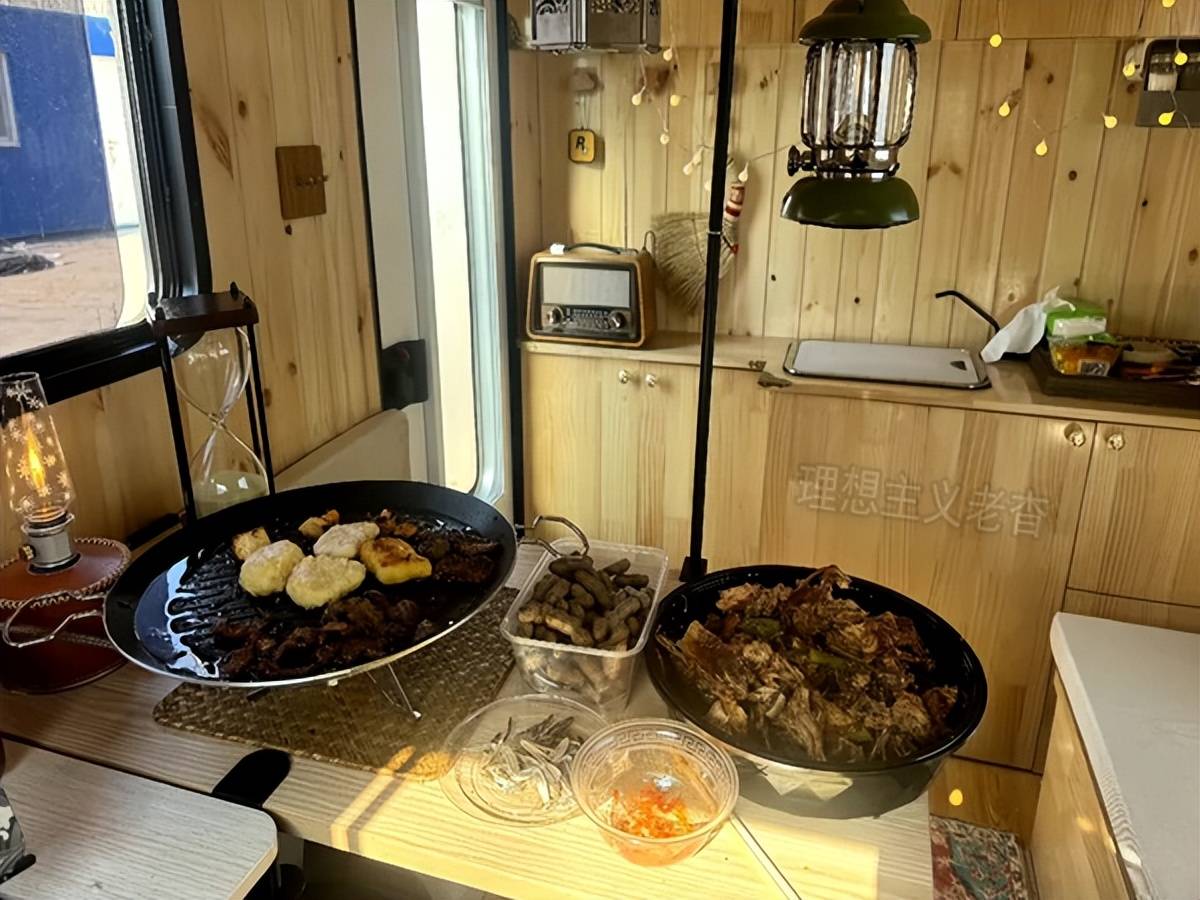 箱内采用纯实木装修,更有居家氛围,前面是厨房区,厨柜下面有水有电有炊具,上面有洗菜池和电磁炉,已做好一桌子美味佳肴,自驾游路上一样能够吃饱喝足。
