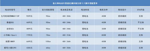 第十六期参与测评的电动车是九号机械师MMAX110P、雅迪DS5、台铃GC6、小牛MQi+Sport、绿源INNO9及爱玛小爱E390六款车型。