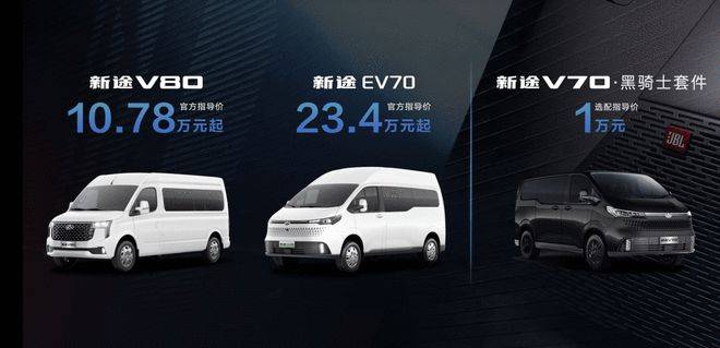 近日,随着上汽大通MAXUS“购车狂欢节”的到来,上汽大通MAXUS也正式发布了全新轻客品牌“新途”,同时推出新品牌旗下的四款产品,包括:新途V90、新途V80、新途EV70以及与用户共创而来的新途V70黑骑士版。价格方面,新途V80售价10.78万起;新途EV70售价23.4万起;另外针对新途V70官方还推出了黑骑土定制套装,售价为1万元,而新途V90即刻开启预订。