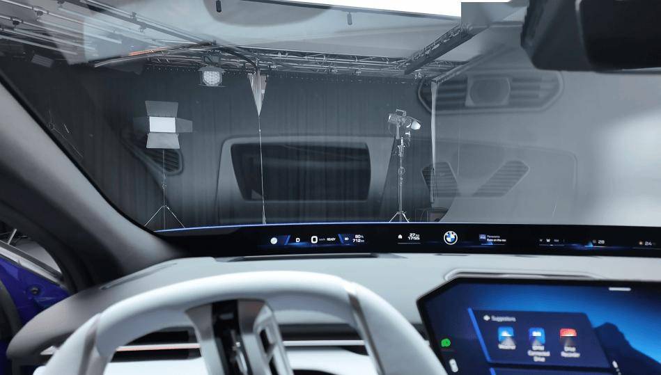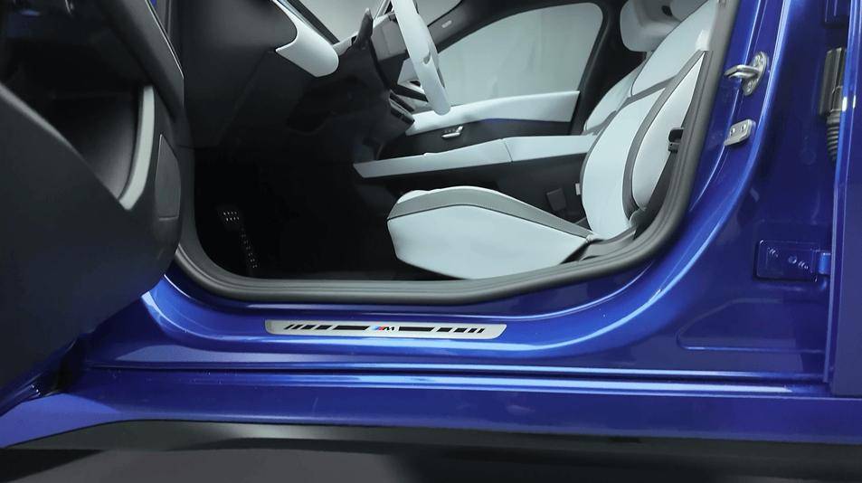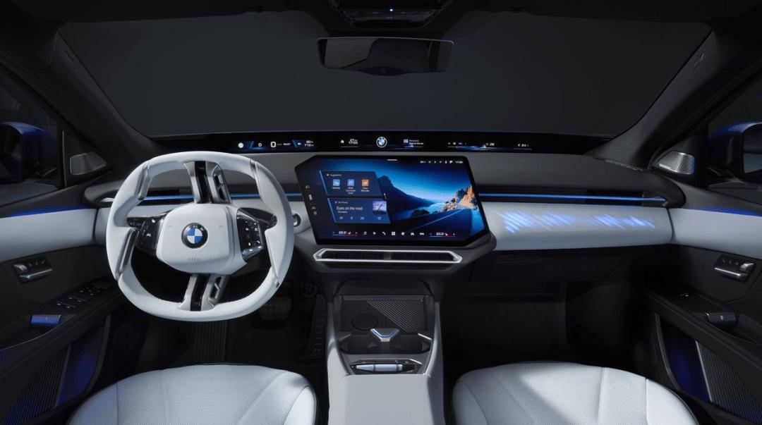 这个基本就是 iX3 的风格大差不差了。像是这个纵向条幅方向盘,视平线全景显示,还有左倾的车机屏,都如出一辙。