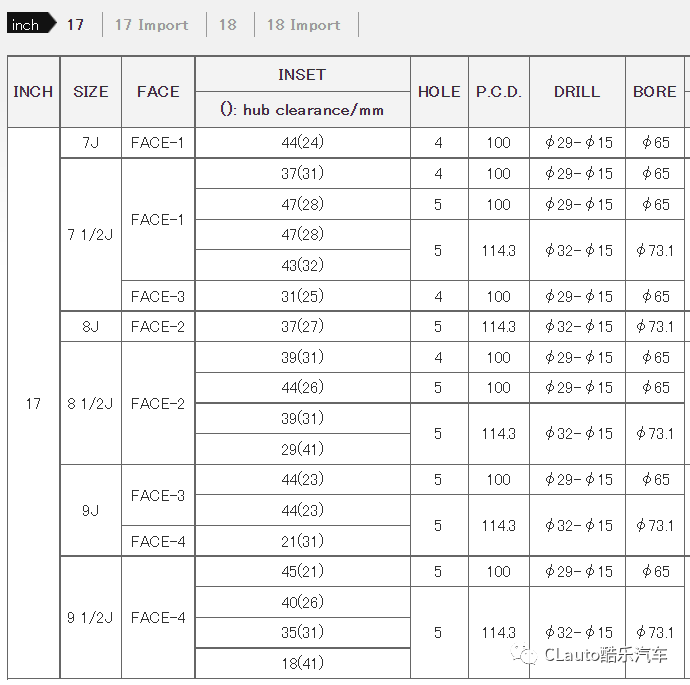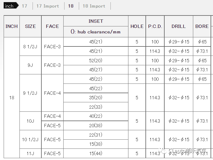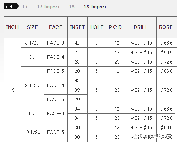 18寸,从8.5到11J的日系数据,包括5*100和5*114.3,新老86和BRZ车型的前后配自然不用说,其他的JDM车型最大能配到11J-ET15的数据,可谓是相当的夸张了。
