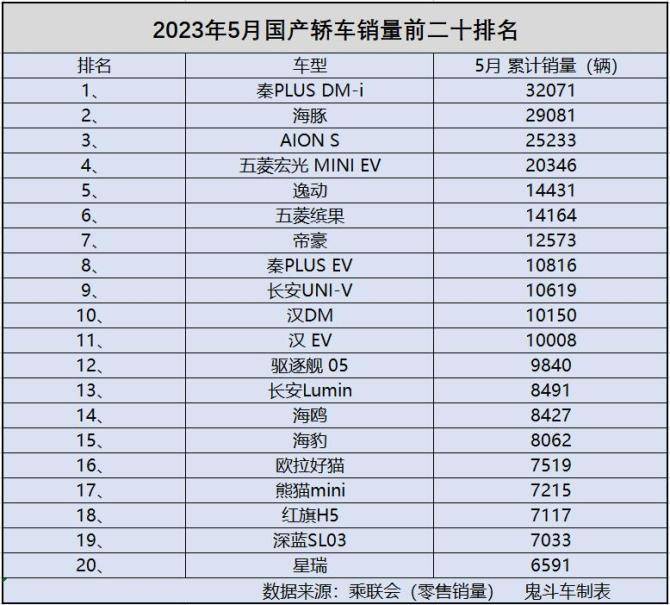 国产轿车别乱买 5月销量榜单出炉 海豚第二 帝豪第七