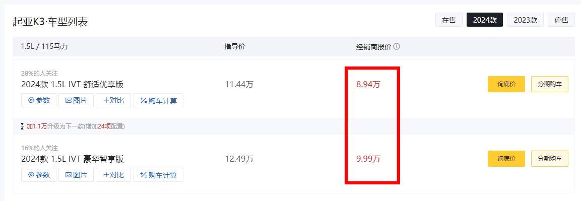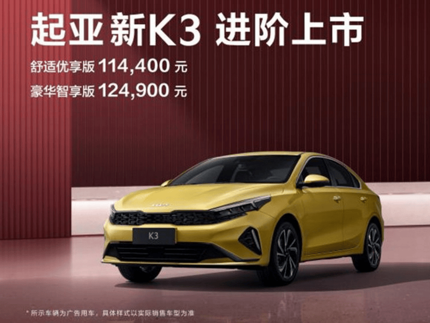 目前最新款的2024款起亚K3是在今年2月份所正式上市的,新车共推出2个配置,而售价则为11.44-12.49万元区间。