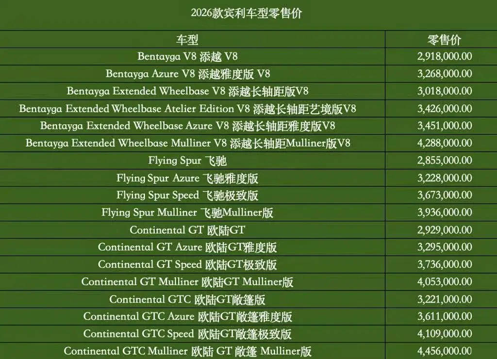 日前,2026款宾利车型正式上市,其中新款添越共有6款车型,售价区间291.8-428.8万元;新款飞驰共有4款车型,售价区间285.5-393.6万元;新款欧陆GT共有8款车型,售价区间292.9-445.6万元。