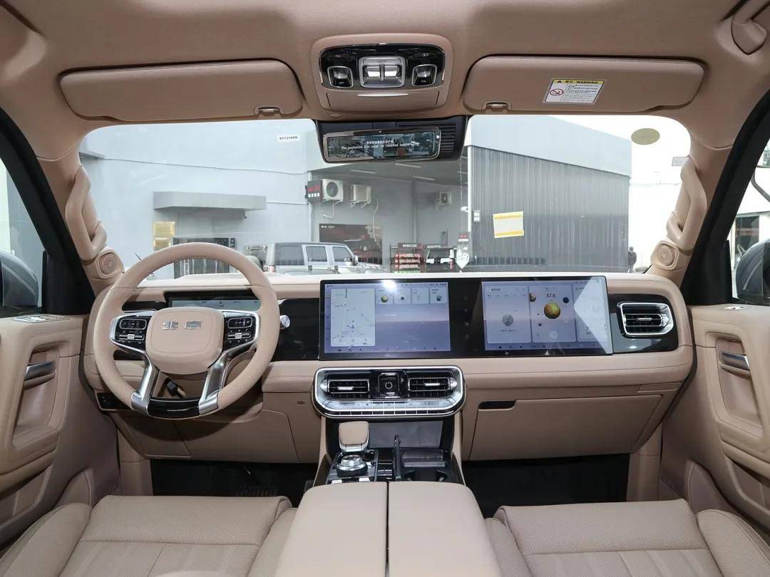 内饰方面,BJ60雷霆行政版配备了10.25英寸全液晶仪表、双12.8英寸中控与副驾双联屏、1.92英寸启动按键屏、9英寸流媒体后视镜、HUD抬头显示,保留了大量实体按键,操作方便。行政版车型还采用了全新深灰色配色,全车座椅和车顶都用翻毛皮质感材质包裹,增加了后排座椅电动调节,提升了车内的舒适性和豪华感。长宽高分别为5040/1955/1925mm,轴距为2820mm。