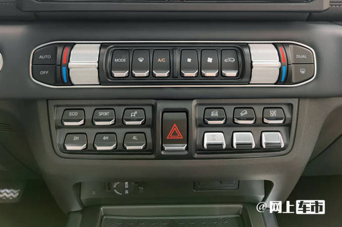 新车搭载的分时四驱系统可切换低速四驱、高速四驱,提供沙地、岩石等驾驶模式;还配备陡坡缓降、前后两把差速锁、可断开防倾杆,越野性能大幅提升。