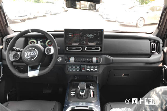 全新212内饰配备内嵌液晶仪表+悬浮式中控屏,保留空调+越野功能实体按键,配备电子挡杆。新车提供前排座椅加热/按摩、后排座椅比例放倒、全维度6轴陀螺仪越野信息显示系统等。