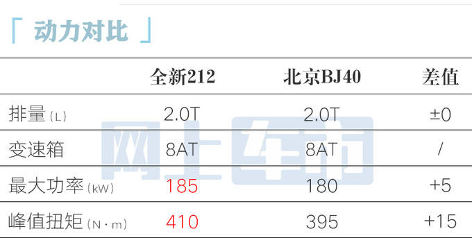 全新212采用五连杆整体桥式悬架,拥有40°接近角和36°离去角;搭载哈尔滨东安汽车发动机公司生产的2.0T发动机,动力较212经典大幅提升。