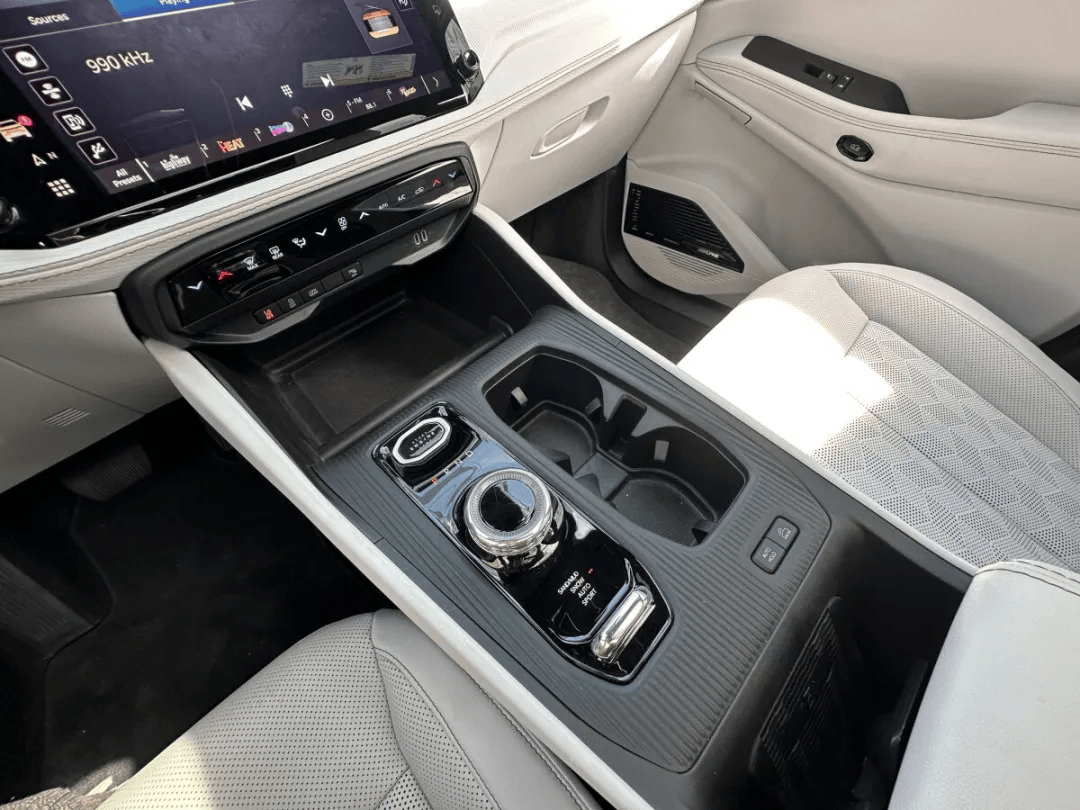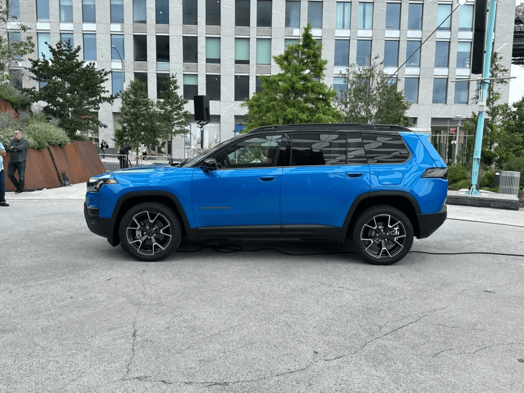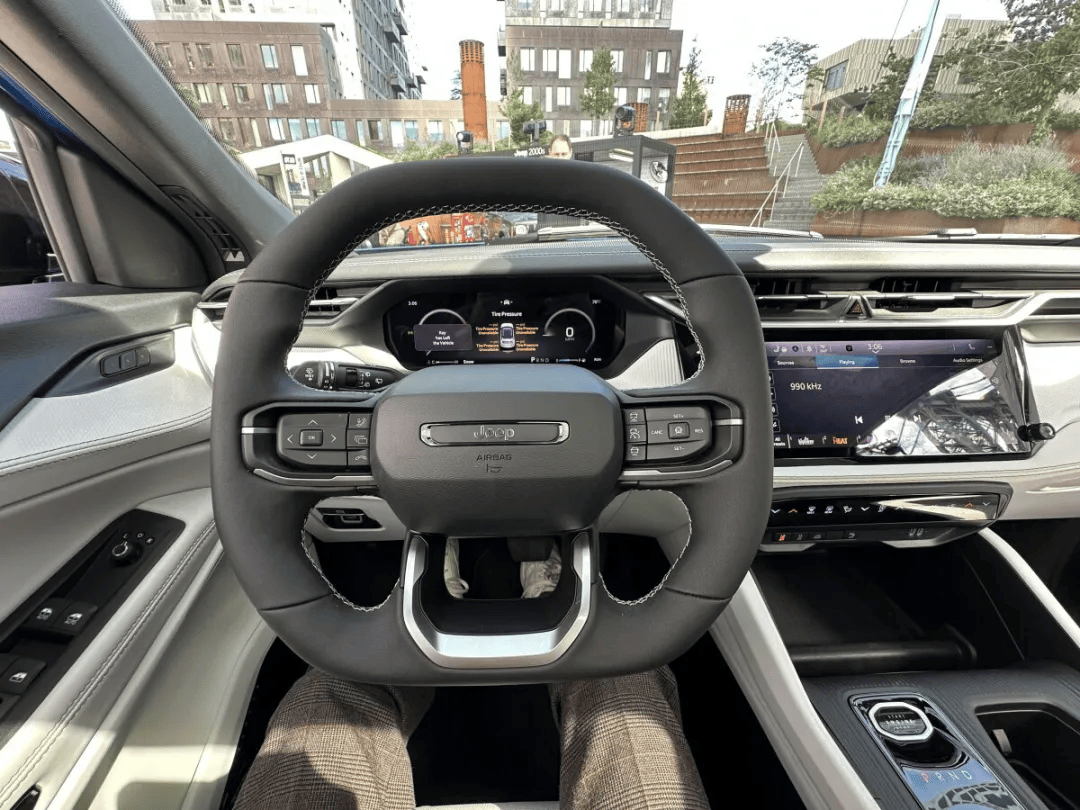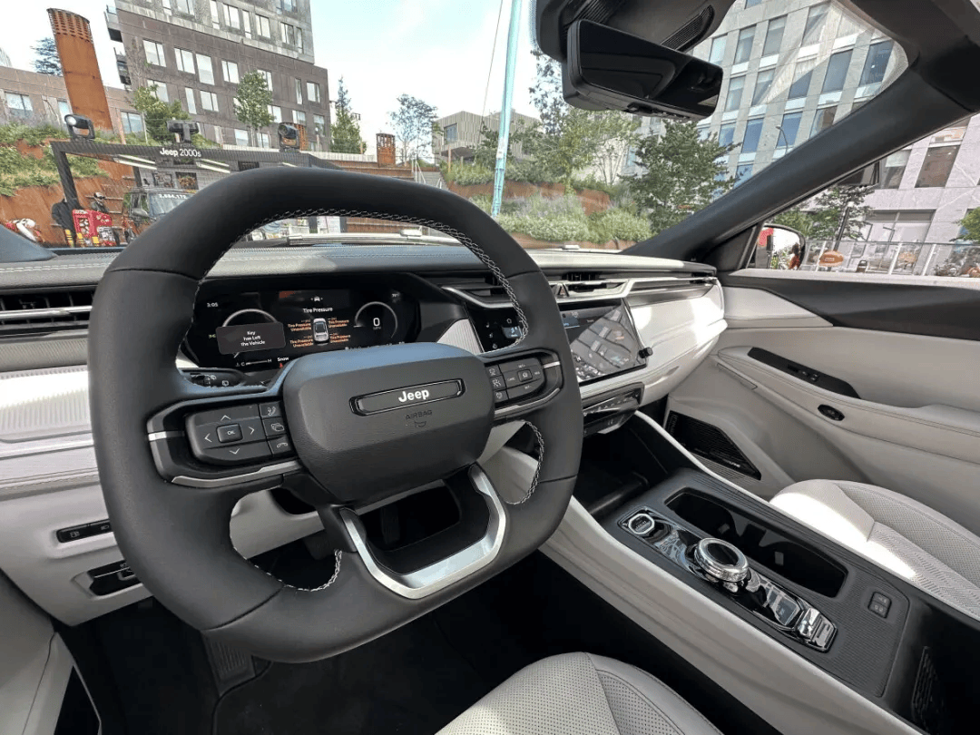 内饰方面,新车配备多边形的方形多功能方向盘,并搭配内嵌式的10.25英寸全液晶仪表盘,中控台中间同样是内嵌式的12.3英寸多媒体触控屏,并内置Uconnect 5信息娱乐系统,中控屏下方则配备触控式的功能控制按键以及必要的物理按键,中控台通道区域还设有旋钮式的电子换挡机构以及驾驶模式选择按键,车内整体设计风格与Jeep Wagoneer S相似。此外,新车取消传统车内开门拉手,改为按键式设计。