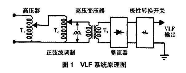 该设计的基本思路是产生像正弦波那样的超低频波形,用超低频以低充电电流、相对长一点的时间间隔对试品充电至高压。这里超低频的波形是关键特别适合的是正弦波,因其避免了其他波形可能产生的高频谐波(高频谐波会对测试目标产生驻波或有害的电压突变)。通过图l可以很清晰地理解该设计的基本理念。系统所需的输入功率是从一个正常的120V,60 Hz或220 V,50 Hz的电源处获得。输出电压的振幅是由自动可调变压器控制的,图l中用Tl来表示。该变压器的输出用相应需要的0.1 Hz超低频来调节,该过程在图1中用T2来表示。T2的输出以正弦波模式周期性地增加或减少,频率是2倍的输出频率,这样就会产生—个60Hz(或50Hz)电压。该调制工频电压经过高压变压器逐步升压,图l中用T3表示。该高压变压器的输出通过—个能产生单极电压的全波整流器来整流。后,整流器与终端之间的一个极性开关每隔半个周期就会将整流后的电压的极性颠倒一次。输出电缆和被测试品的电容将提供充足的滤波,以便将120Hz的波动减至一个可接受的水平,其终波形显示出来—个高压超低频正弦波。