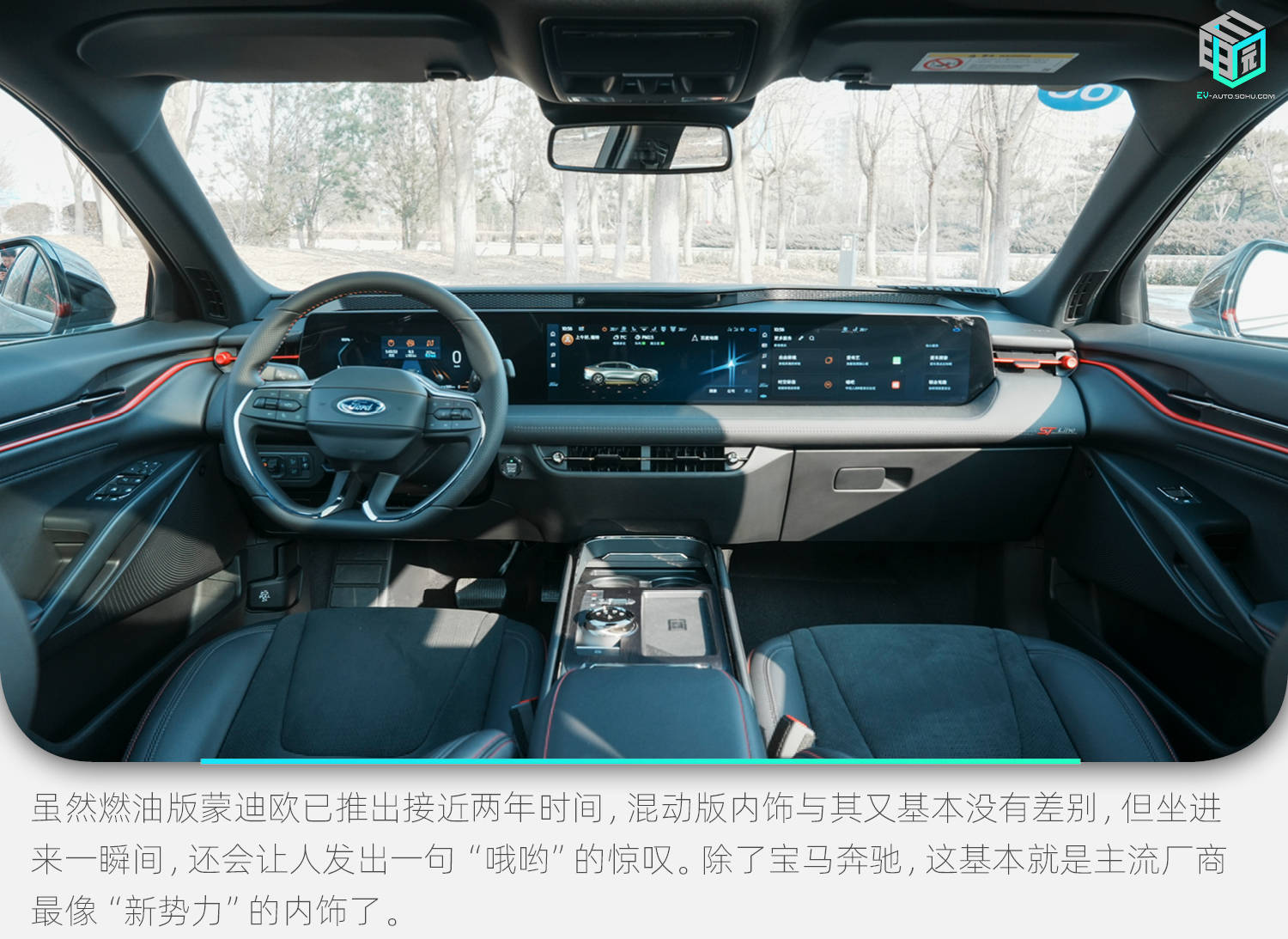 虽然燃油版蒙迪欧已推出接近两年时间,混动版车型的内饰与其又基本没有差别,但坐进来的一瞬间,还会让人发出一句“哦哟”的惊叹。我敢说,除了宝马奔驰,这基本就是主流厂商最像“新势力”的内饰了。