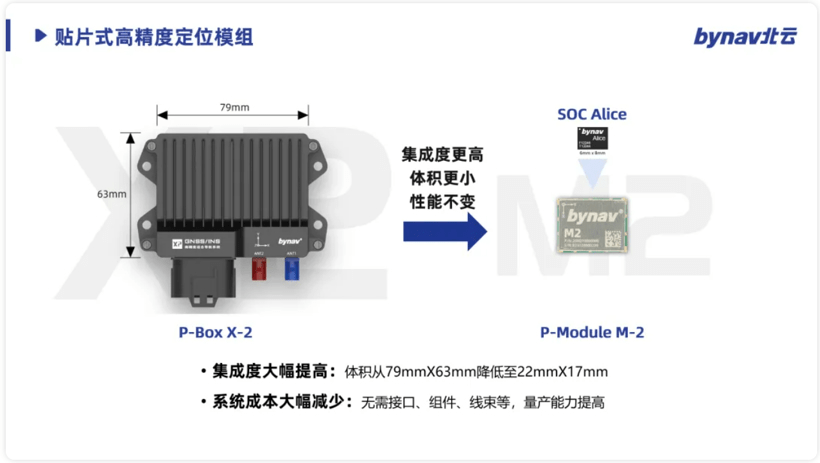此次发布的还有北云科技新推出的M2系列高精度定位/组合导航模组。基于Alice芯片开发的M2高精度组合导航模组P-Module,能在“两个指甲盖大小”的体积下(17.0x22.0mm)实现与P-BOX相当的定位性能。