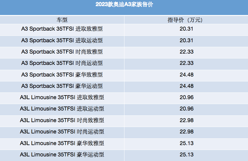 2023款奥迪A3家族正式上市!配置调整,售价20.31万元起