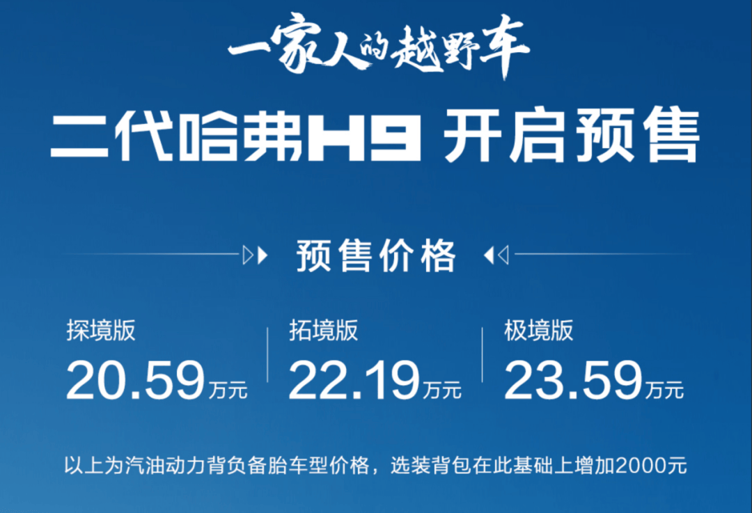 8月25日,哈弗品牌在新疆喀什举办了二代哈弗H9万里长测行动收官仪式暨预售发布会,并公布了二代哈弗H9预售权益,该车共提供三个版本,包括探境版、拓境版和极境版,预售价格分别为20.59万元、22.19万元、23.59万元。