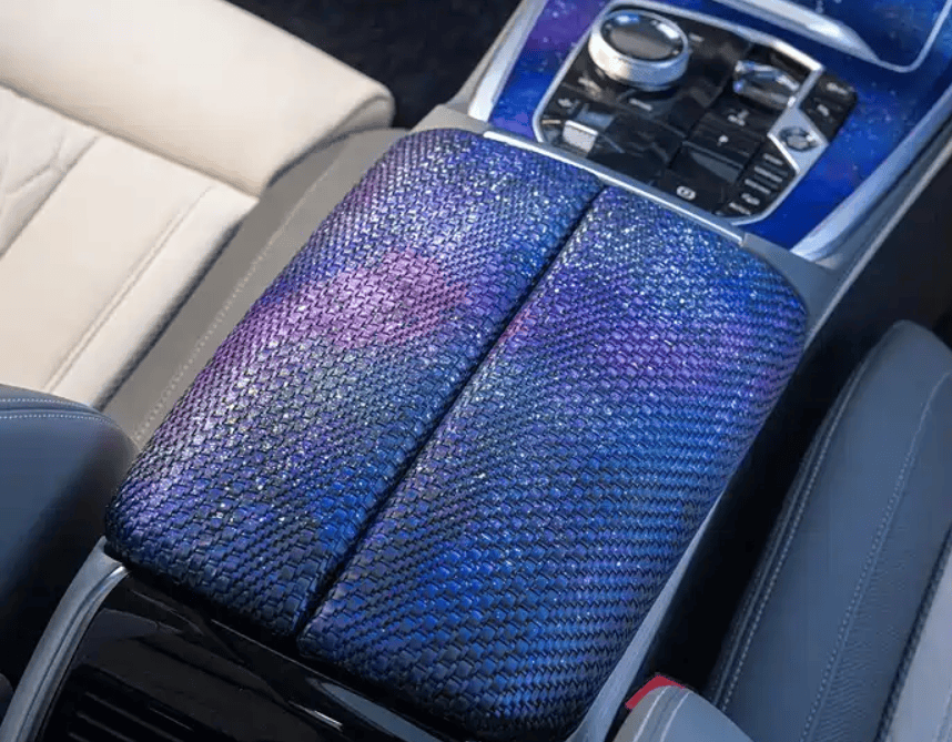 内饰方面,新车内饰与在售车型保持一致,在传统的“西阵织”工艺中加入了银箔和珍珠粉,呈现出梦幻星空的视觉效果,扶手箱位置的“蛇皮”纹理在蓝色“西阵织”工艺的衬托下,更显高端、豪华。