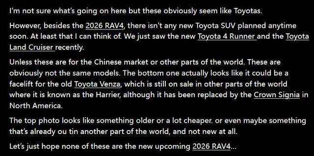 但不管怎么说吧,从这两款新车的谍照来看,念寒觉得还是很有看点的。如果最终的量产车型能够保持谍照上的设计风格,再加上丰田一贯的品质和可靠性,相信又会成为爆款车型。