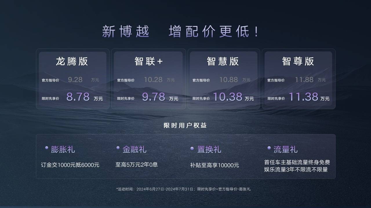 6月27日,新博越焕新上市,全系指导价下调7000元,官方指导价9.28-11.88万元,同时享受1000元订金抵6000元购车金限时权益,享受权益后限时先享价8.78万元起。